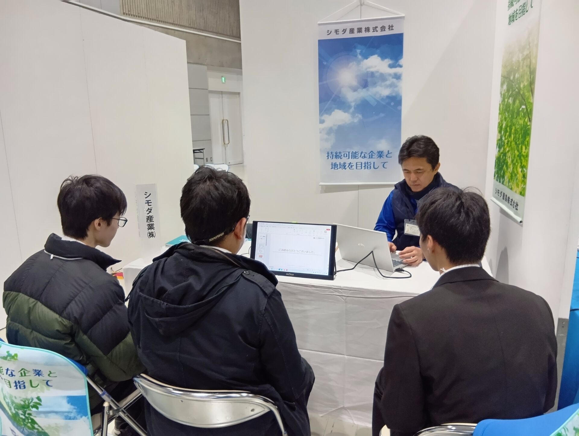 当社は午前の部に参加しました。当社のブースにも多くの学生が来てくれて、25分×4回の説明会では、会社のこと、仕事のこと、そして「持続可能な地域づくり」に向けた当社の取り組みについて、スライドを使いながらお話ししました。