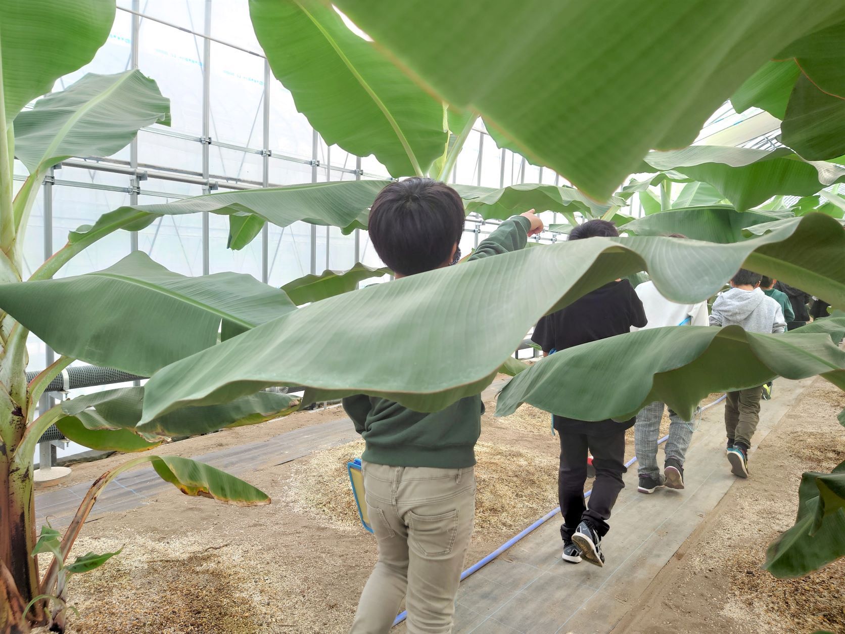 まずは結実したばかりの珍しい状態のバナナを見てもらったり、ジャングルみたいなハウス内を歩いたり。