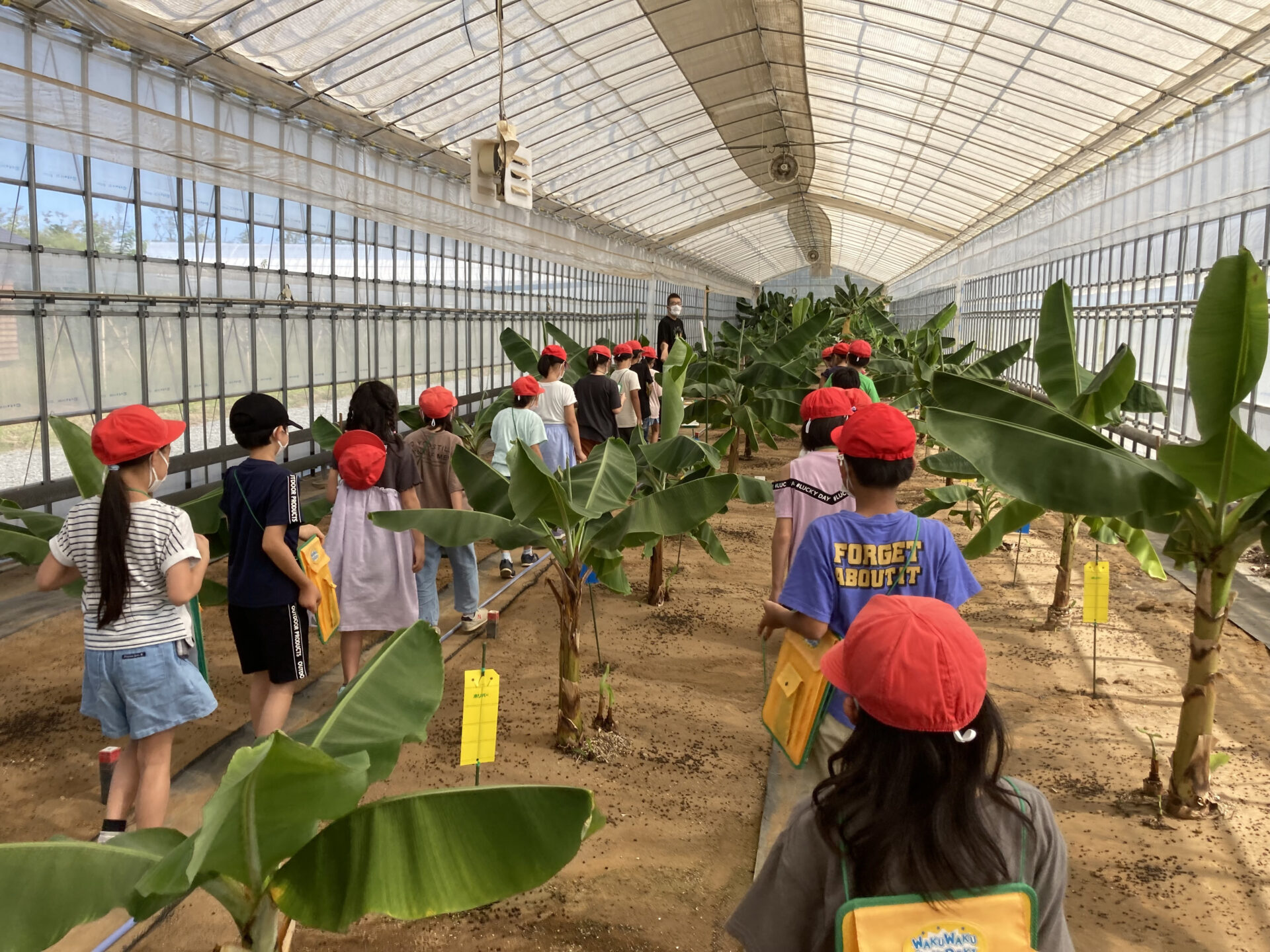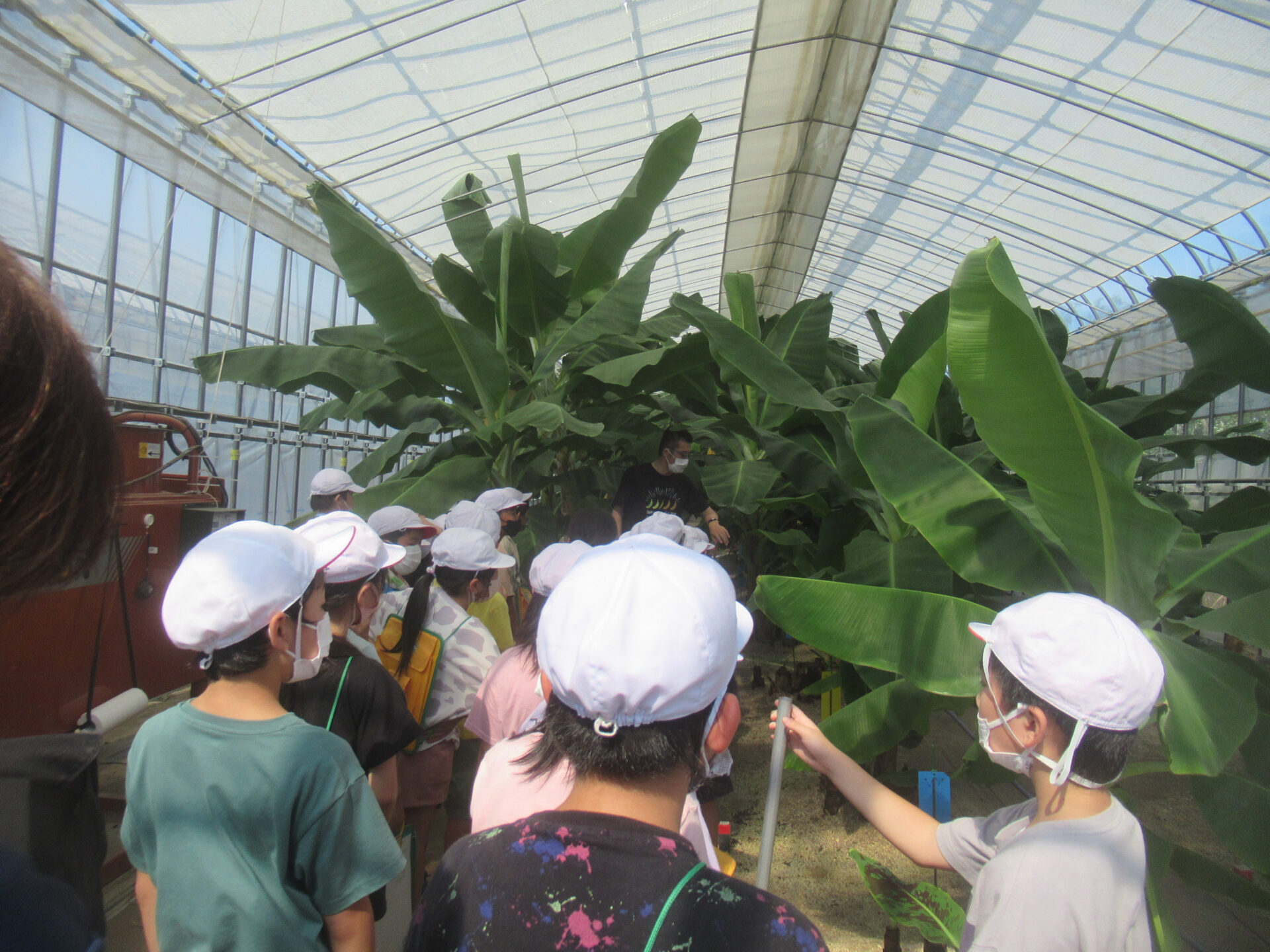 2組に分かれて、シモダファームの説明スライド、焼却炉が稼働している様子、ビニールハウスでバナナが大きく実る様子を見学してもらいました。