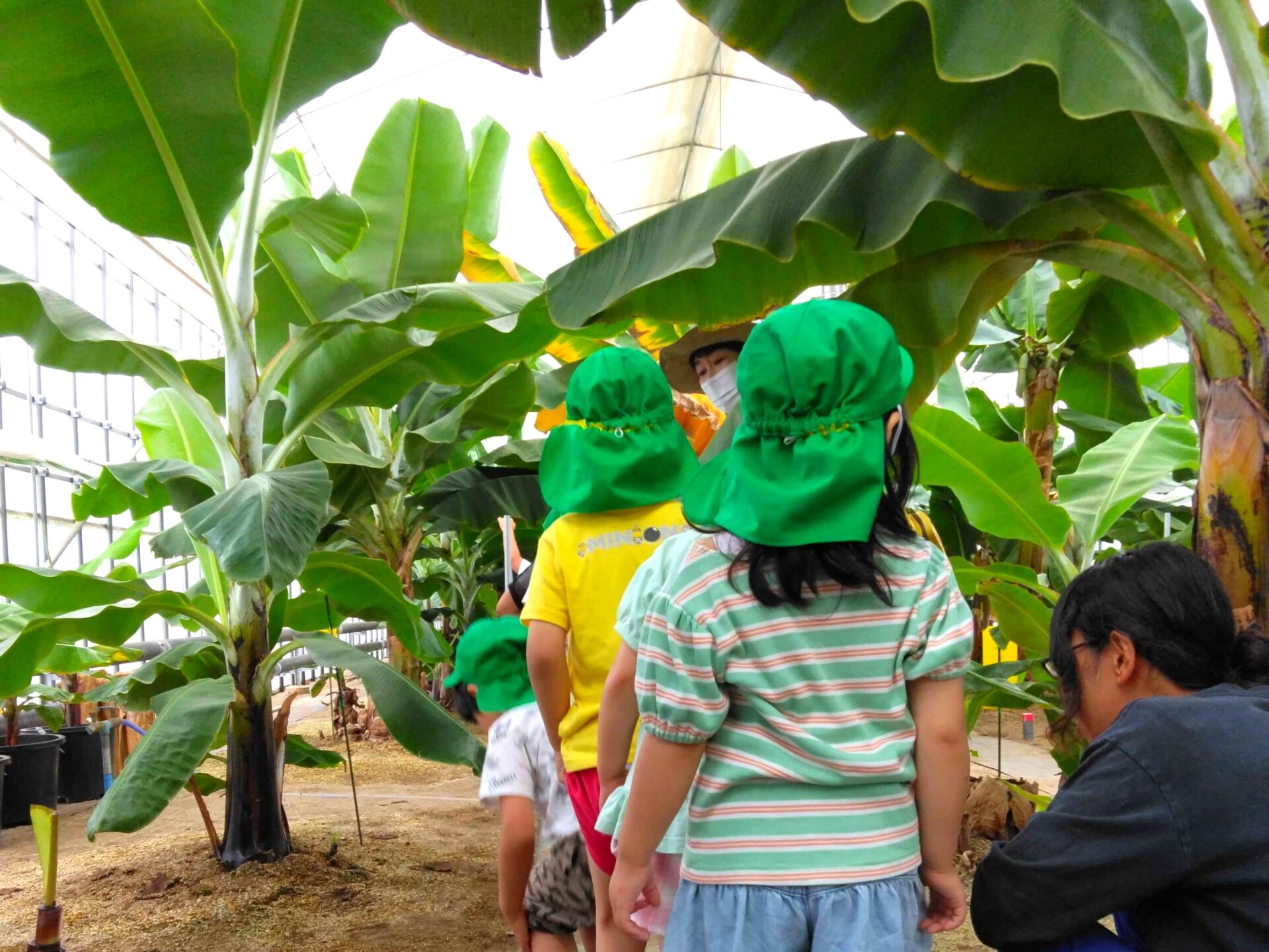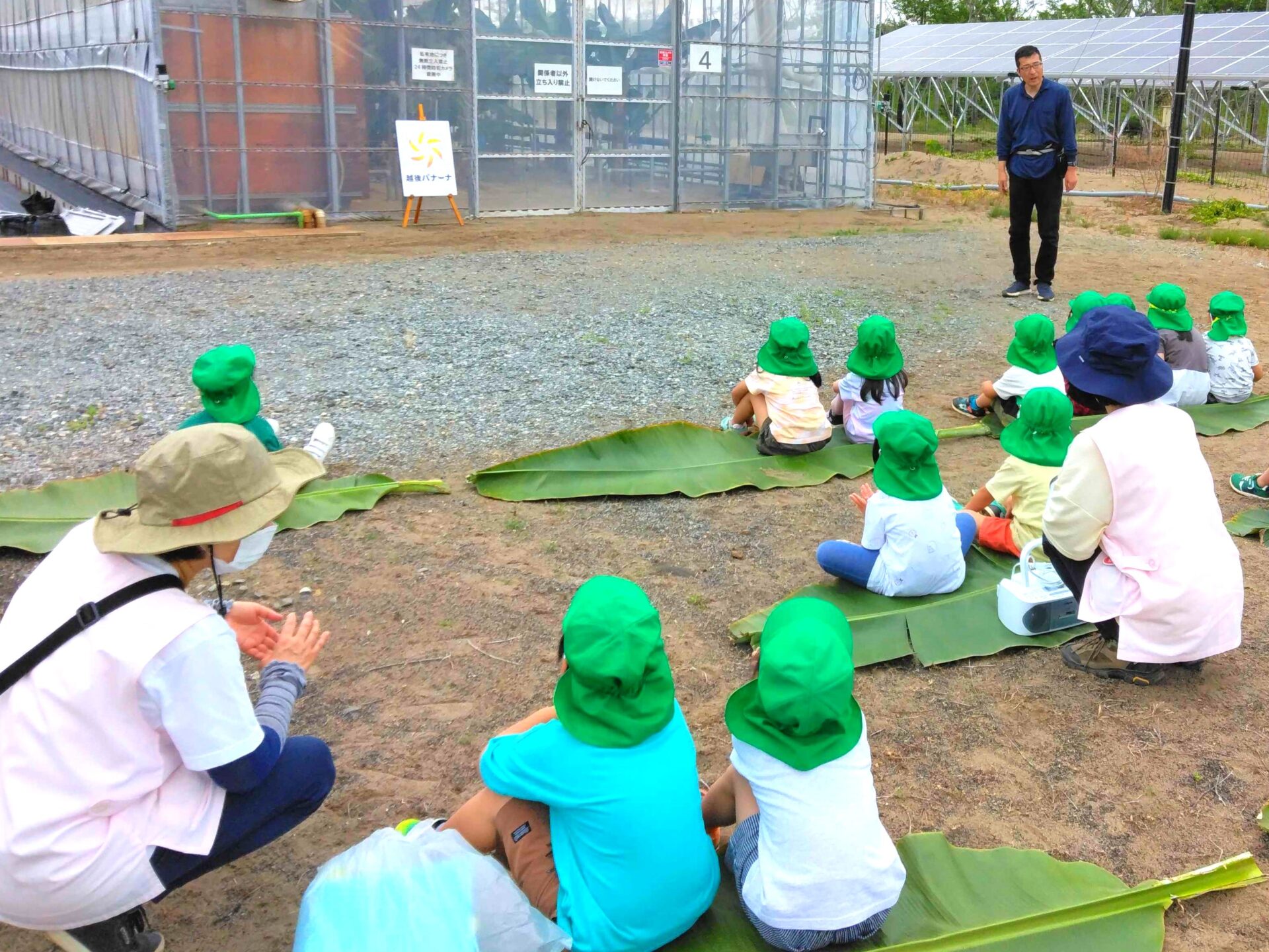 2024.07.11 松波保育園の年長さんが見学に来ました! 会社見学 6月25日に松波保育園の年長さんがシモダファームの見学に来ました。 毎年この時期に来ていただいて、今回で3回目になります。 地面に座っても大丈夫なよう用意したバナナの葉の上に座って、お話をきいていました。 ハウスの中に入ると「大きい!」「すごーい!」と目を輝かせる子どもたち。 とても楽しそうに見学していきました。 最後はお礼のお手紙と「ひょっこりひょうたん島」を歌って踊って見せてもらいました! 荒浜小学校の5年生が工場見学に来ました 「2025 かしわざき高校生対象企業説明会」に参加しました